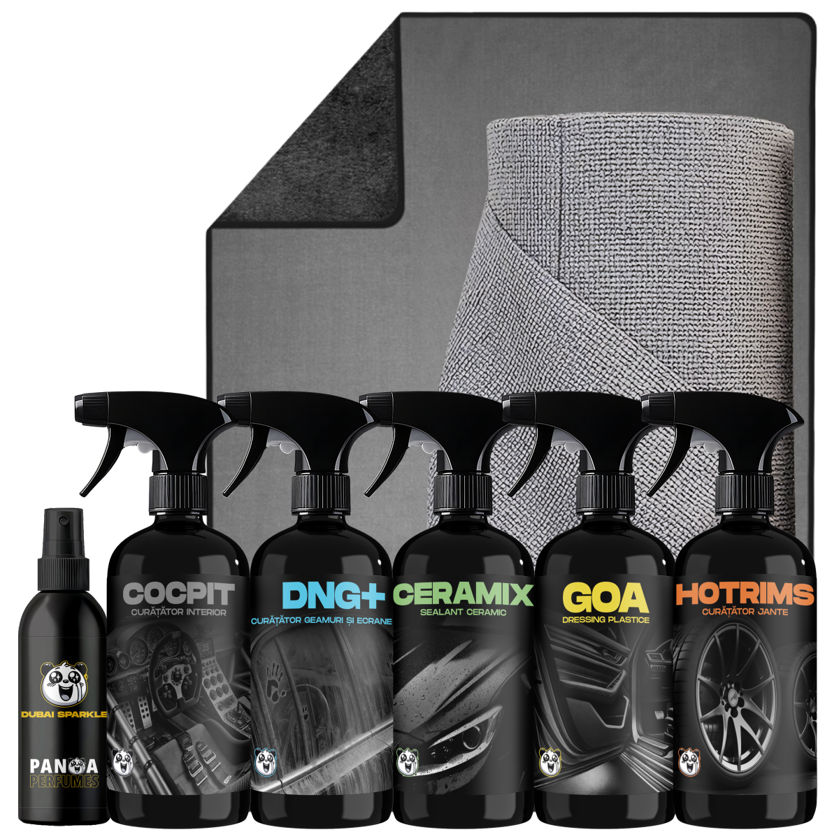 Parfumul auto Dubai Sparkle completează experiența cu o aromă elegantă și orientala, iar rola cu 30 de lavete microfibră 30x30 cm 200GSM și prosopul 90x60 cm 700GSM permit aplicarea rapidă și sigură a tuturor soluțiilor.