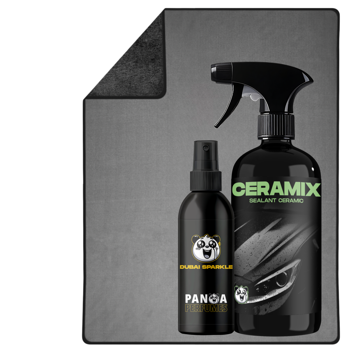 Santa Shine oferă protecție ceramică rapidă cu Ceramix, prosop premium 700GSM pentru ștergere fără urme și parfumul auto Dubai Sparkle pentru o aromă orientala intensă.